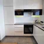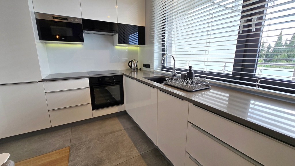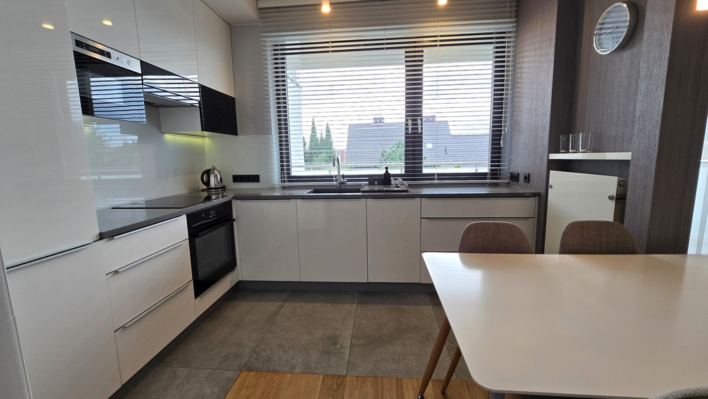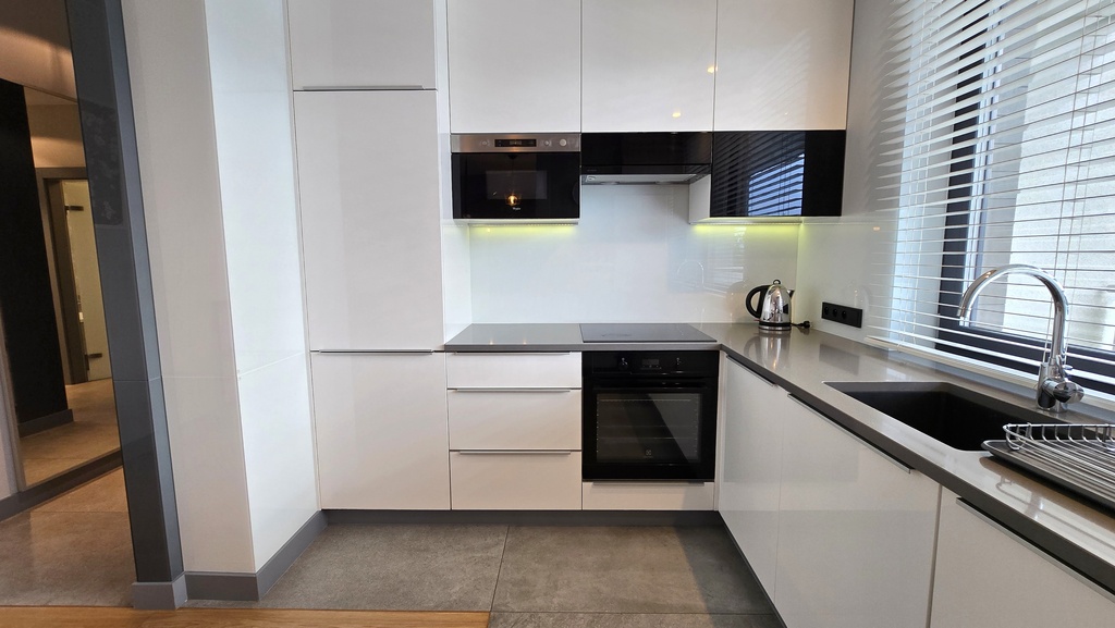 ANEKS KUCHENNY: biała zabudowa na wysoki połysk, wyposażony w sprzęt AGD: lodówkę, zmywarkę, płytę indukcyjną, piekarnik z funkcją mikrofalówki.