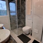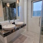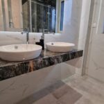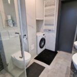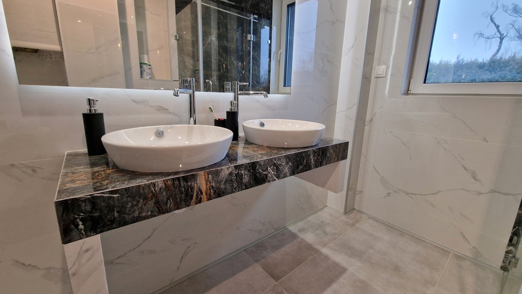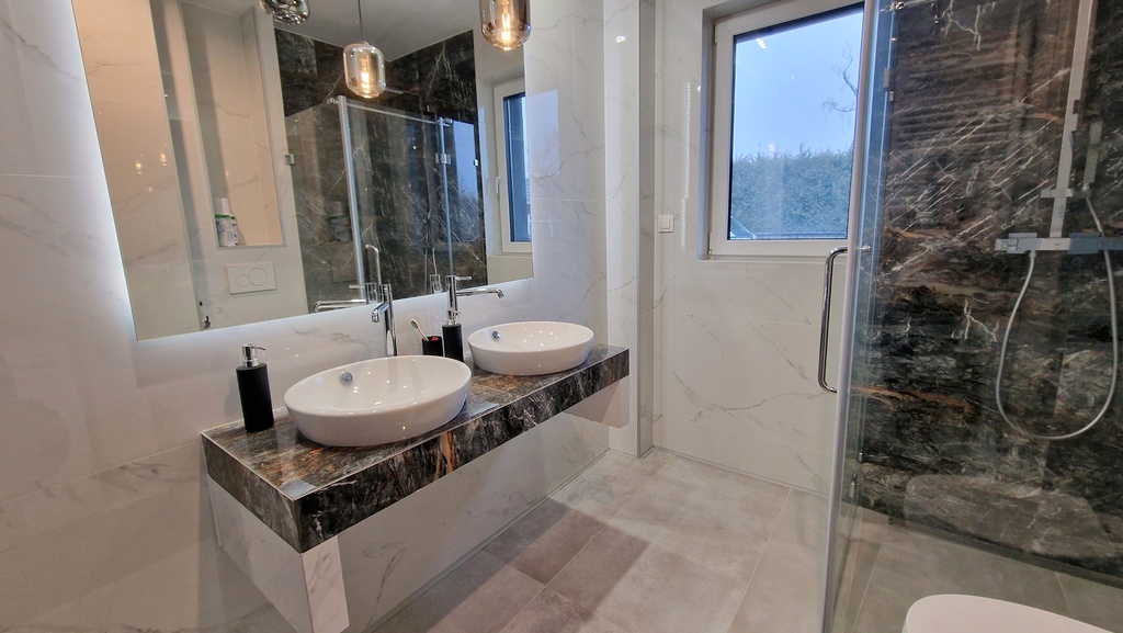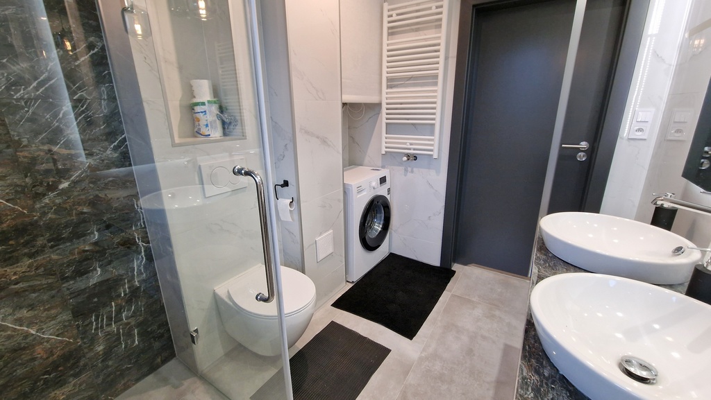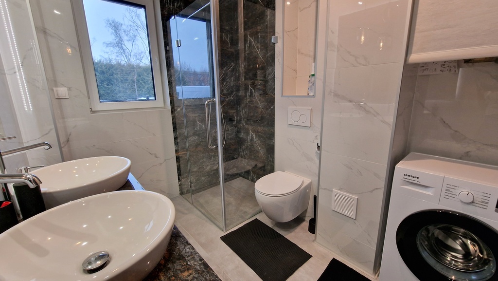 **ŁAZIENKA: duża kabina prysznicowa, pralka, WC, dwie umywalki, podświetlane lustro i szafki zabudowane.