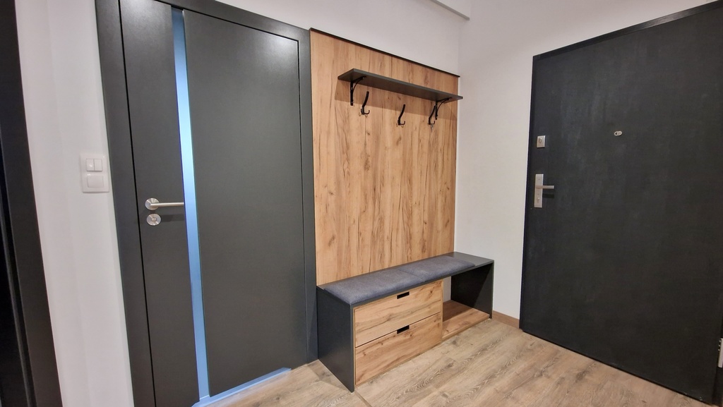 **PRZEDPOKÓJ: wieszak na odzież wierzchnią z wygodnym siedziskiem i szafkami na buty.