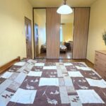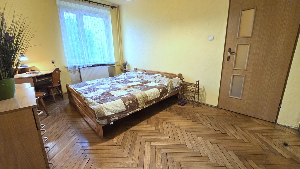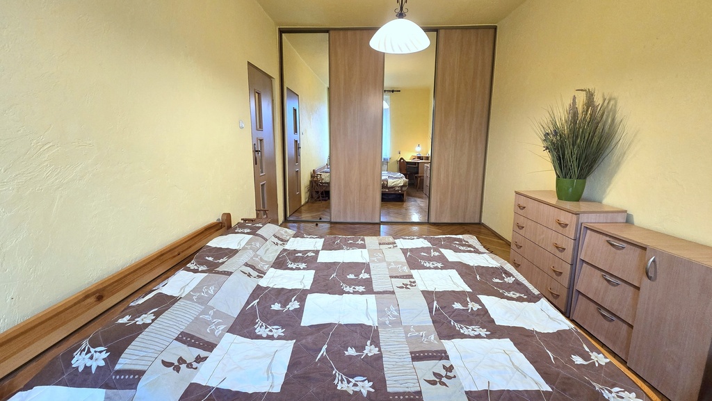 - Sypialnia z pojemną szafą w zabudowie pełniącą funkcję garderoby