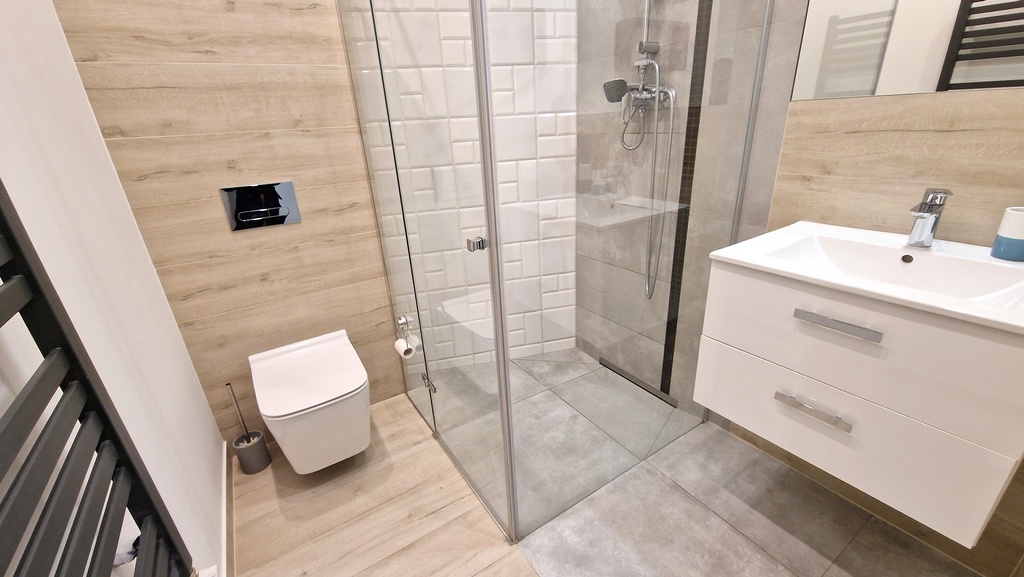 - Łazienka z dużym prysznicem