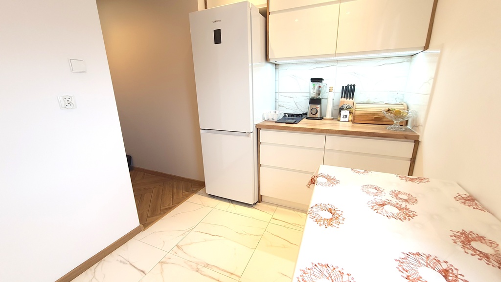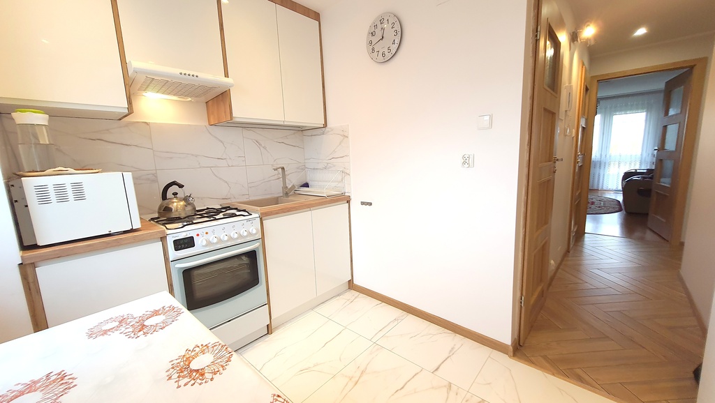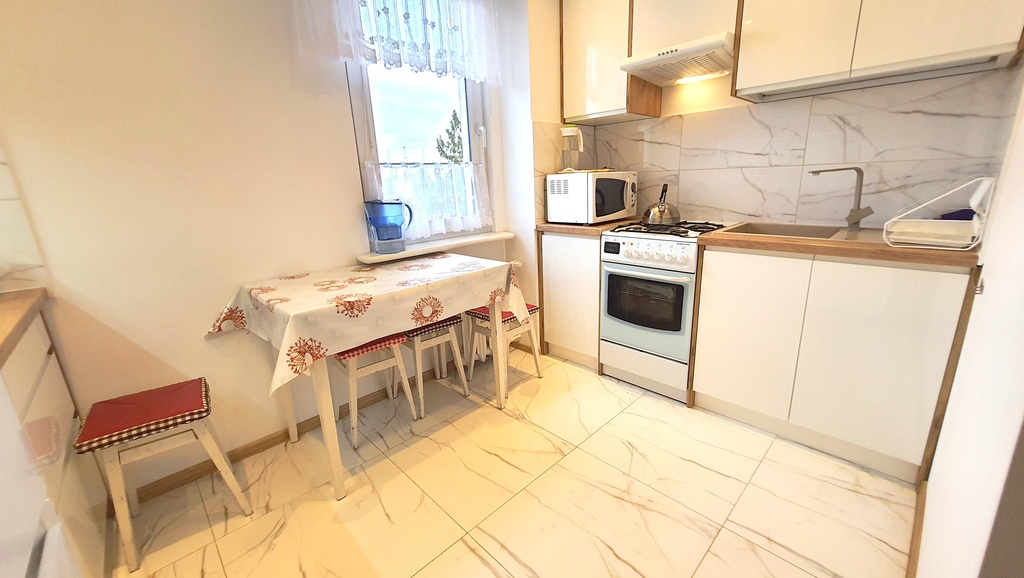 - Kuchnia wyposażona w nowoczesną zabudowę wraz ze sprzętem AGD