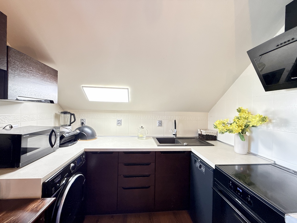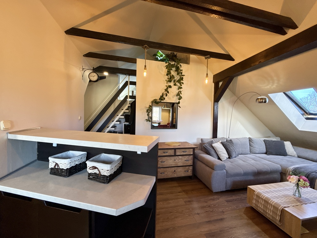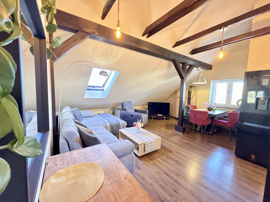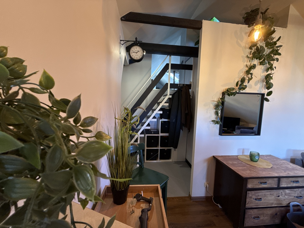 Mieszkanie ma nietuzinkowy charakter przez belki stropowe, skosy i niestandardową bryłę, jest pięknie zaaranżowane, i pozwala się poczuć komfortowo. Mimo, że jesteśmy w bloku czujemy się jak w domu, a niewielka społeczność tej spółdzielni funkcjonuje w przyjemnej symbiozie.