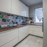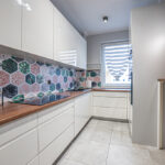 - Kuchnia w zabudowie 🍳 – projekt na wymiar, lakierowane fronty, pełne AGD: lodówka z zamrażarką, piekarnik, płyta elektryczna, zmywarka, mikrofalówka.