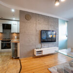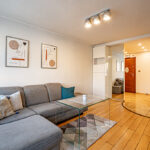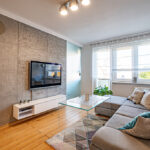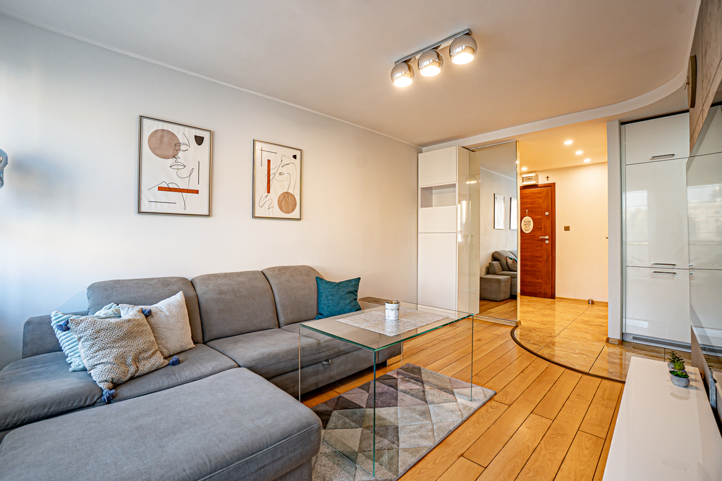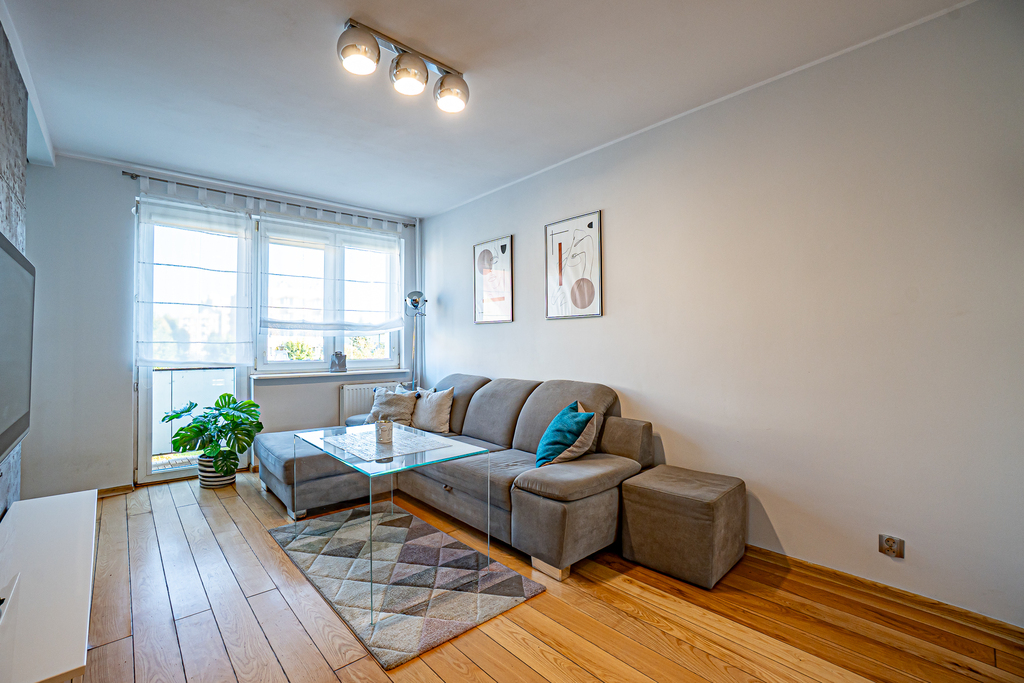 – przestronny salon ze strefą wypoczynkową i wyjściem na balkon.
