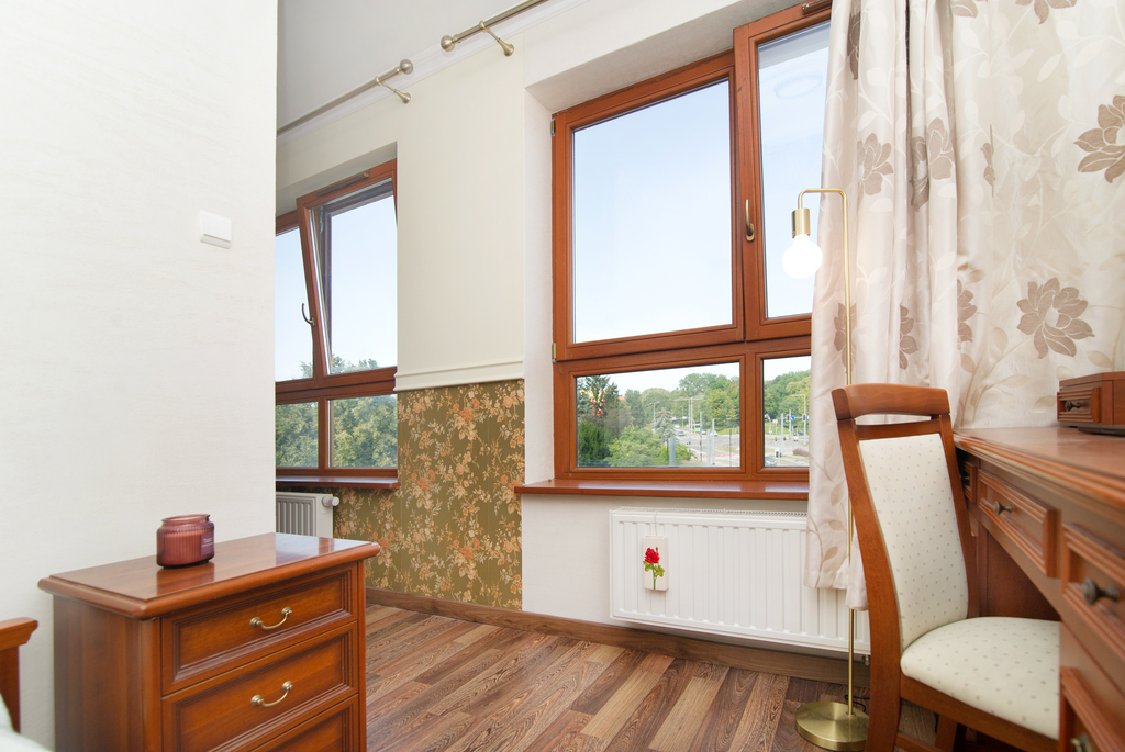 Jednym z największych atutów mieszkania są duże okna, które zapewniają świetne doświetlenie wnętrz oraz piękny widok na ratusz i otaczającą zieleń miejską, a także wyjątkowo duży balkon, idealny do wypoczynku i spędzania czasu na świeżym powietrzu.