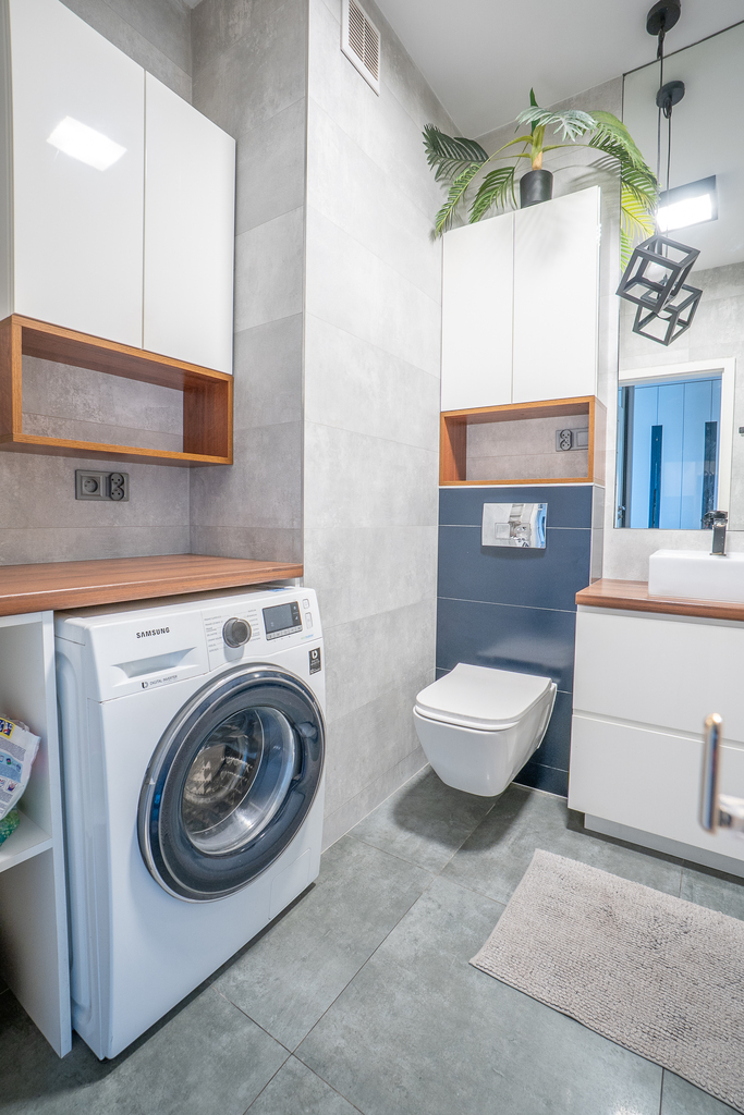 Łazienka – elegancka armatura, kabina prysznicowa, pralka, wysokiej jakości kafle.