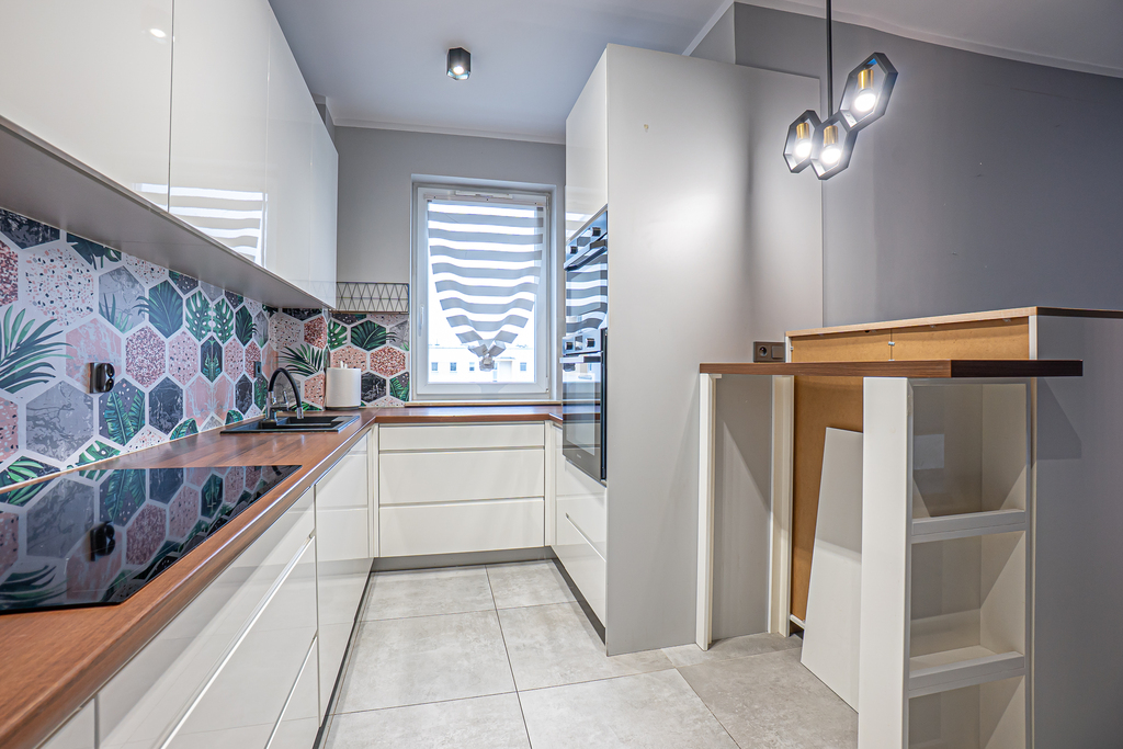 Wnętrze zaprojektowane z myślą o komforcie Całość wykończona 4 lata temu z dbałością o każdy detal, przy użyciu materiałów z najwyższej półki – od eleganckich podłóg, przez lakierowane fronty mebli, po nowoczesne oświetlenie.