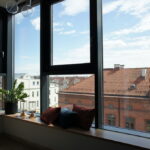 Widok z okna na pięknie zachowany, ceglany budynek poczty.