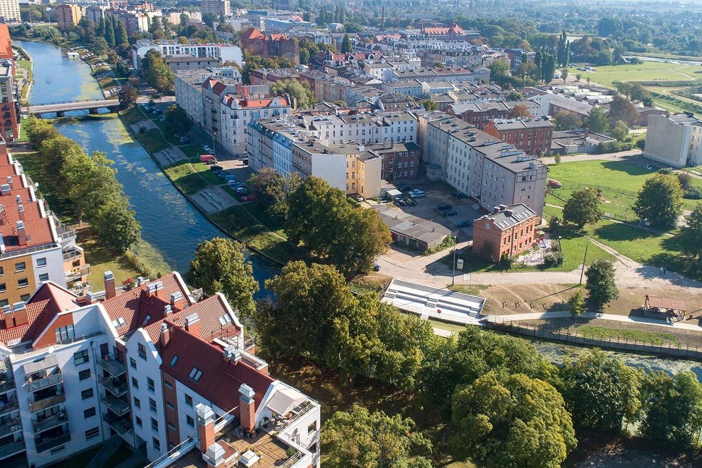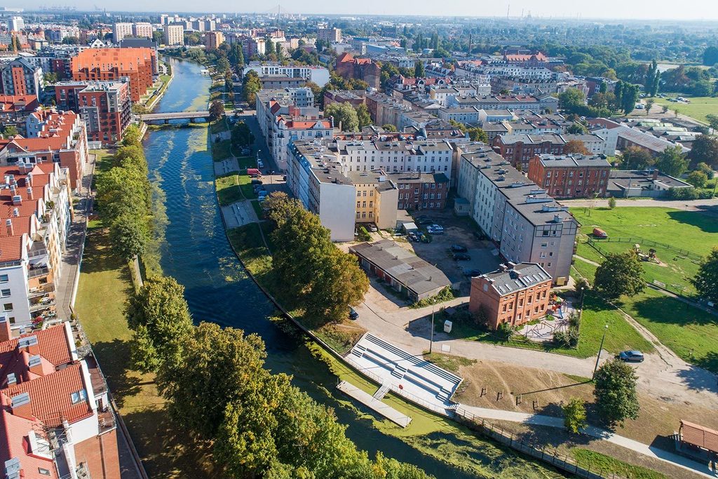 Dużo terenów zielonych, bastiony, opływy Motławy, parki, skwery, przystań kajakowa.