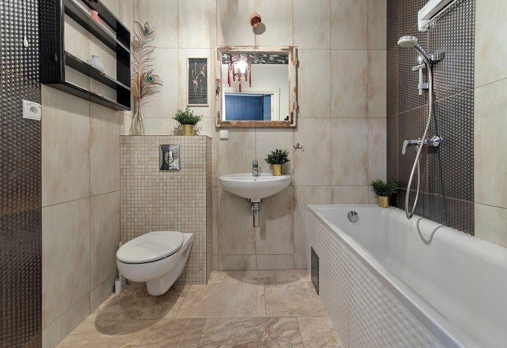 W łazience znajdziemy wannę z funkcją prysznica (2w1).