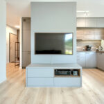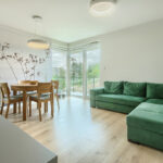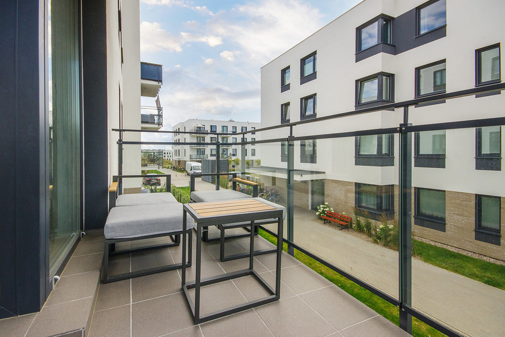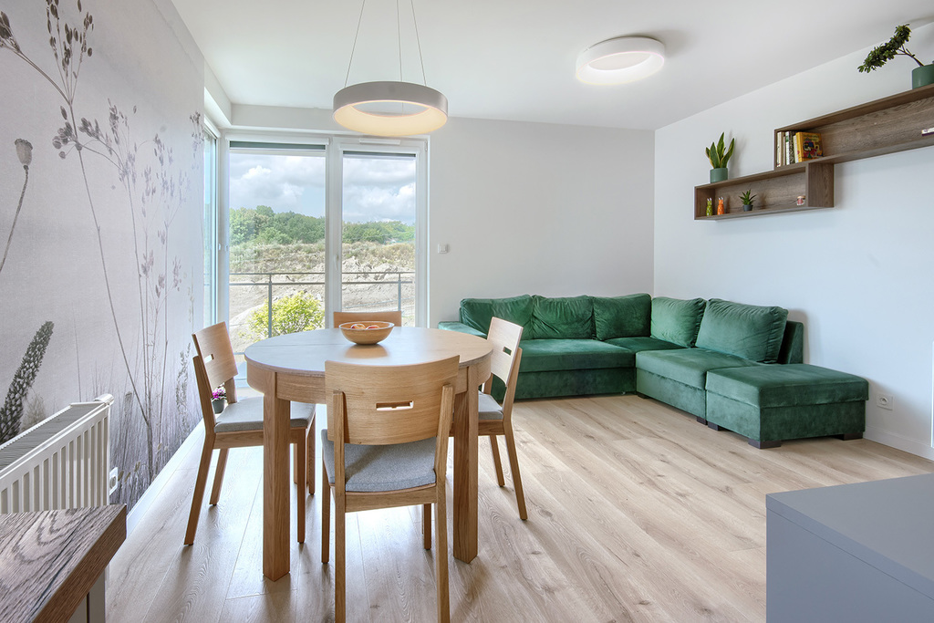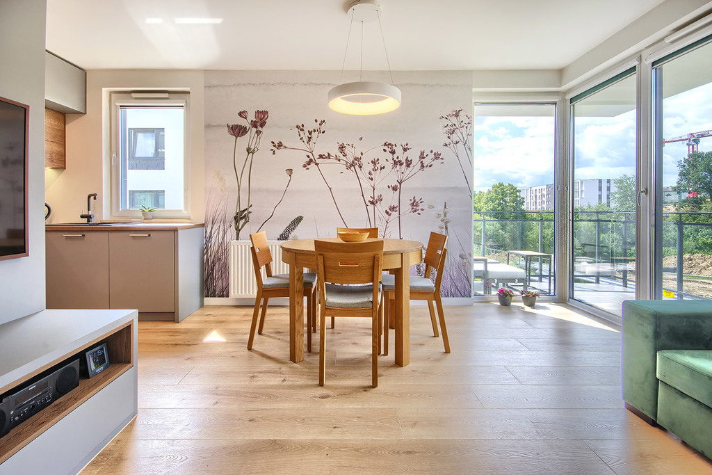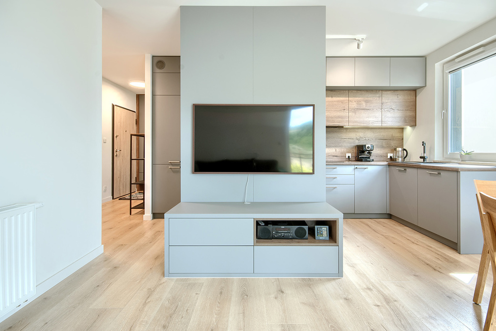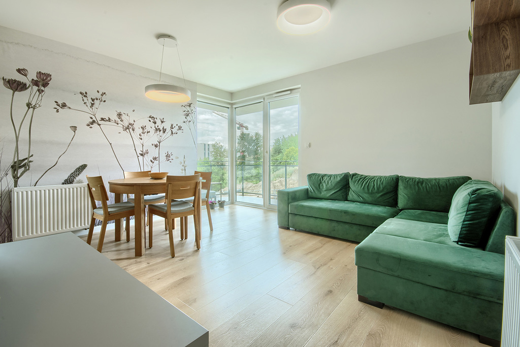 - salonu z aneksem kuchennym (25,5 m2) z wyjściem na słoneczny narożny balkon (8 m2) od strony południowo zachodniej.