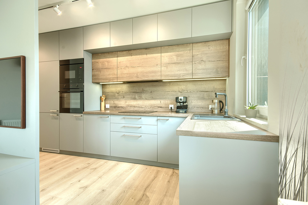 Kuchnia - bardzo dobrej jakości funkcjonalna zabudowa kuchenna wraz z dedykowanym sprzętem (lodówka, płyta indukcyjna, piekarnik, zmywarka) posiadającym jeszcze gwarancję.