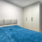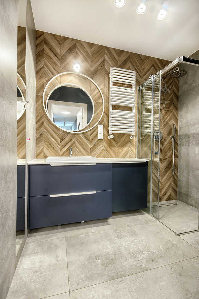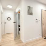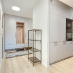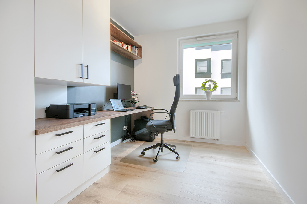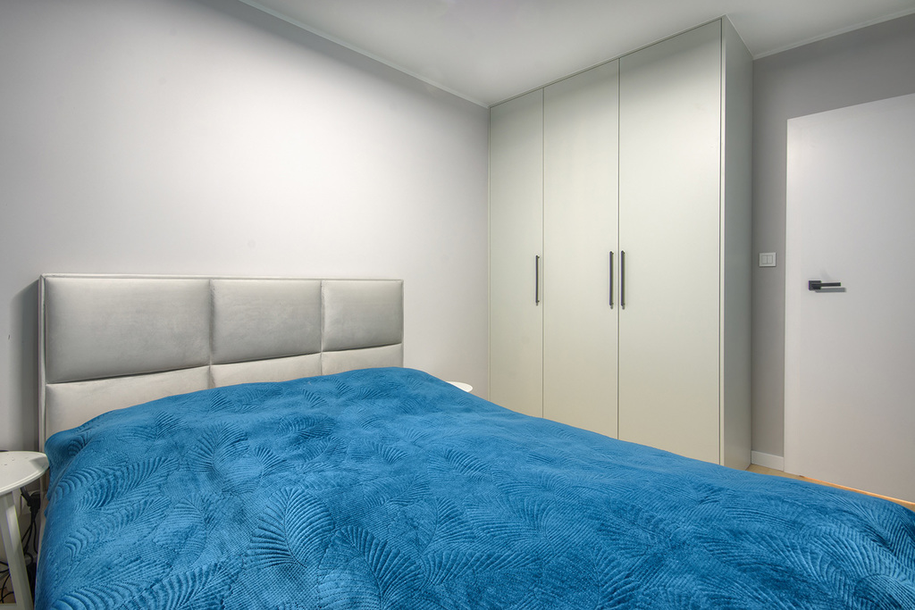 Szafy: Pojemne zabudowy w przedpokoju, sypialni oraz pokoju biurowym jakościowo scalają nienachalny wystrój mieszkania oparty na minimalizmie i funkcjonalności