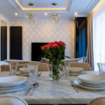 W  salonie znajdują się m.in.:  kanapa oraz zabudowa meblowa zostały wykonane na zamówienie (fronty akrylowe wysokiej jakości), fazowane lustra na ścianach w sztukaterii ściennej. Dodatkowego charakteru pomieszczeniu dodaje elegancki sufit napinany oraz wysokiej klasy oświetlenie.