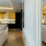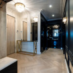 W przedpokoju znajduje się pojemna szafa wykonana na wymiar wraz z tapicerowanym siedziskiem. Na przeciwległej ścianie zainstalowano także ozdobne fazowane lustra.
