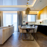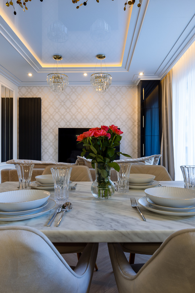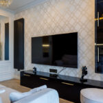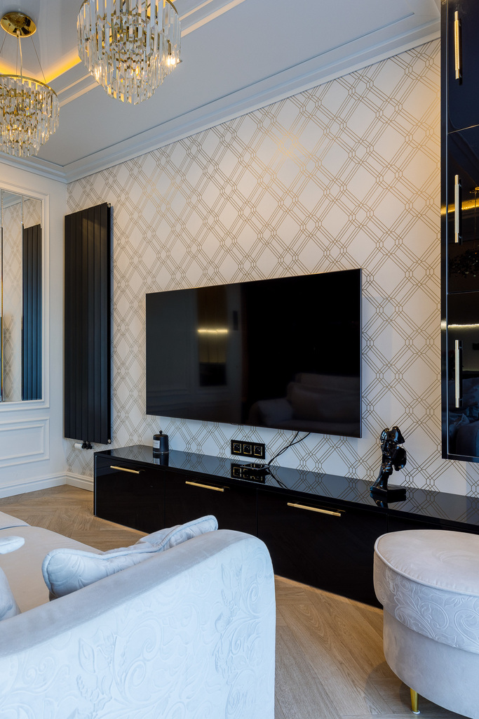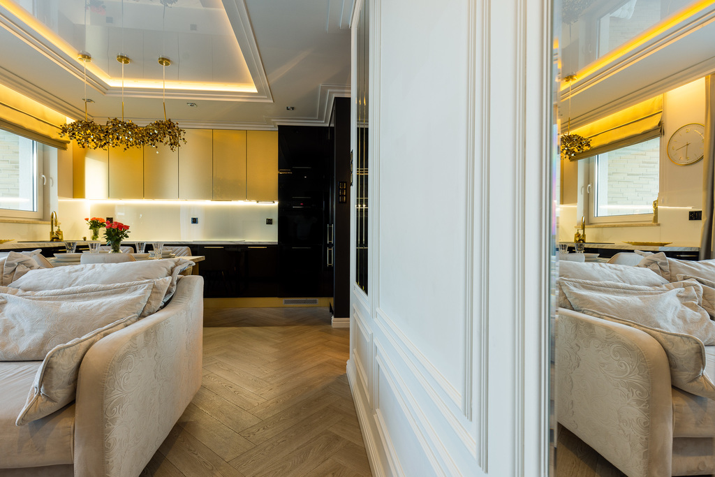 W salonie znajdują się m.in.: kanapa oraz zabudowa meblowa zostały wykonane na zamówienie (fronty akrylowe wysokiej jakości), fazowane lustra na ścianach w sztukaterii ściennej. Dodatkowego charakteru pomieszczeniu dodaje elegancki sufit napinany oraz wysokiej klasy oświetlenie.