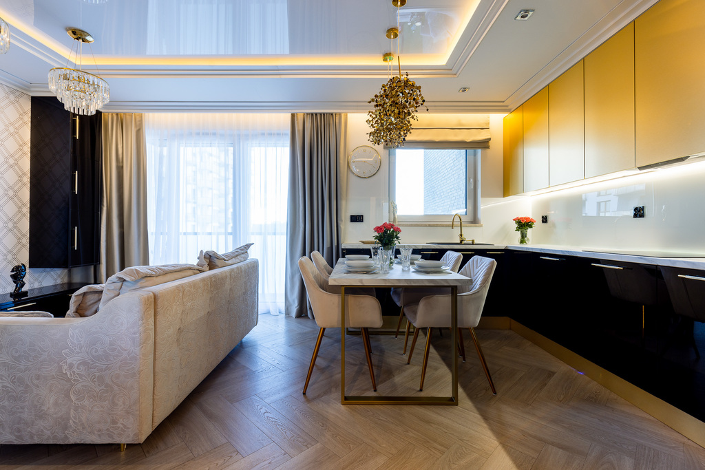 Aneks kuchenny zaopatrzony jest we wszelkie niezbędne sprzęty AGD takie jak: piekarnik, płyta indukcyjna, zmywarka, lodówka. Zamontowany został także granitowy zlew oraz złota bateria. Meble kuchenne zostały wykonane na wymiar z wysokiej jakości materiału.