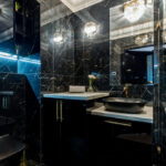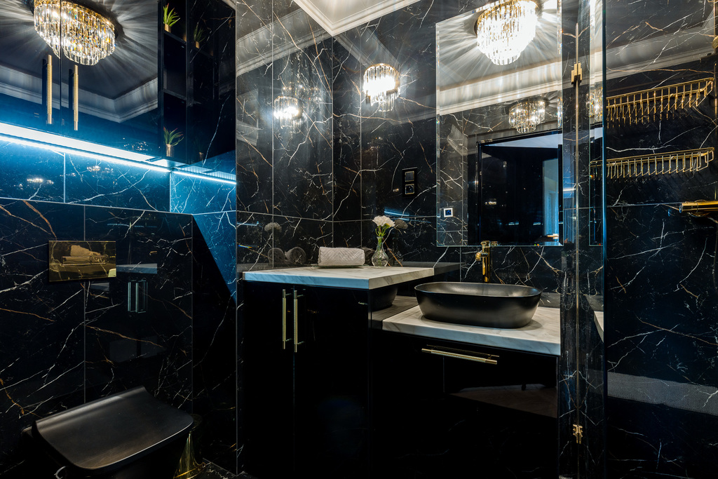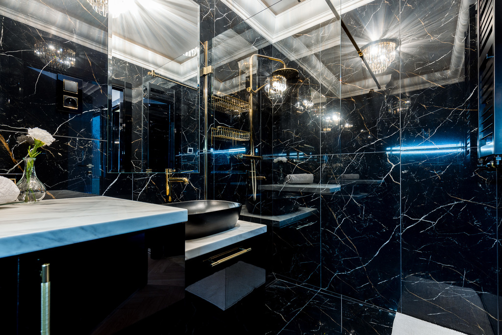 Łazienka w bardzo wysokim standardzie wykończenia. Duży prysznic typu walk in ze złotą armaturą marki OMNIRES dodaje elegancji oraz szyku pomieszczeniu. W łazience znajduje się także pralko-suszarka z pompą ciepła marki AEG ( jedyna pralko suszarka z pompą ciepła dostępna na rynku). W łazience ponadto zainstalowane zostało ogrzewanie podłogowe. Zabudowa meblowa została wykonana pod wymiar.