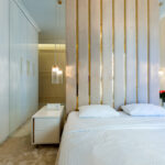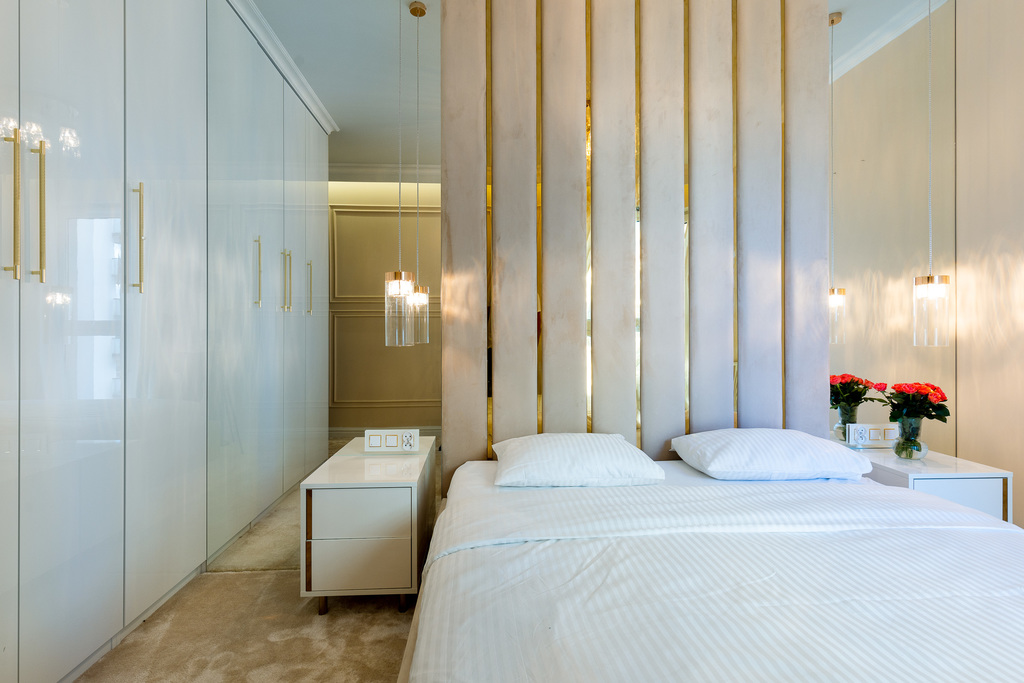 W sypialni znajduje się dwuosobowe, tapicerowane łóżko z ozdobnym wezgłowiem, szafki nocne, oraz przestronna szafa z frontami akrylowymi w kolorze białym.