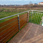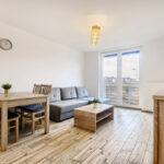 -salon z aneksem kuchennym i wyjściem na balkon z widokiem na tereny zielone,