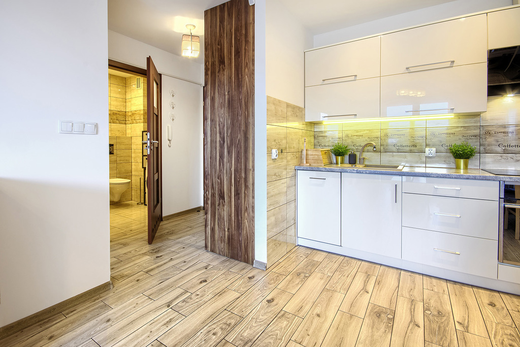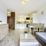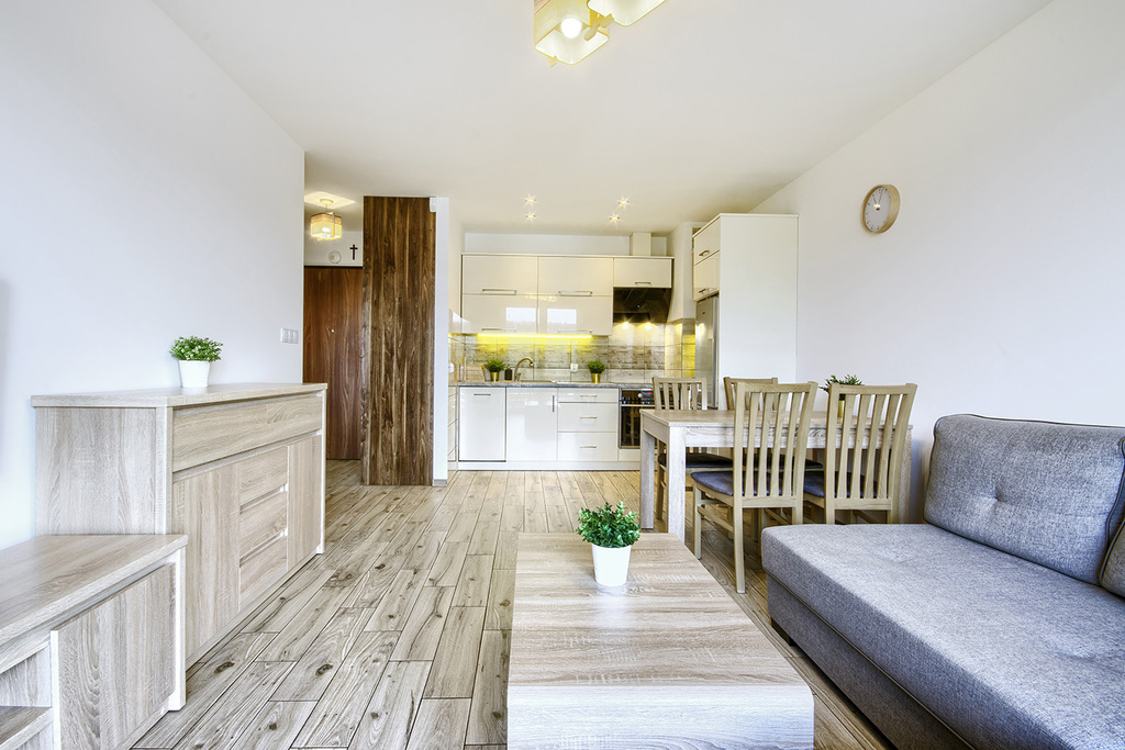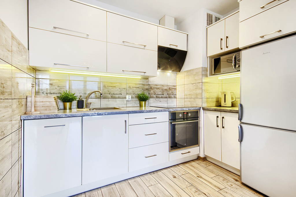 Kuchnia wyposażona jest w: lodówkę z zamrażarką, zmywarkę, płytę kuchenną, okap, mikrofalówkę oraz dodatkowo naczynia, sztućce, garnki.