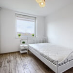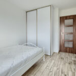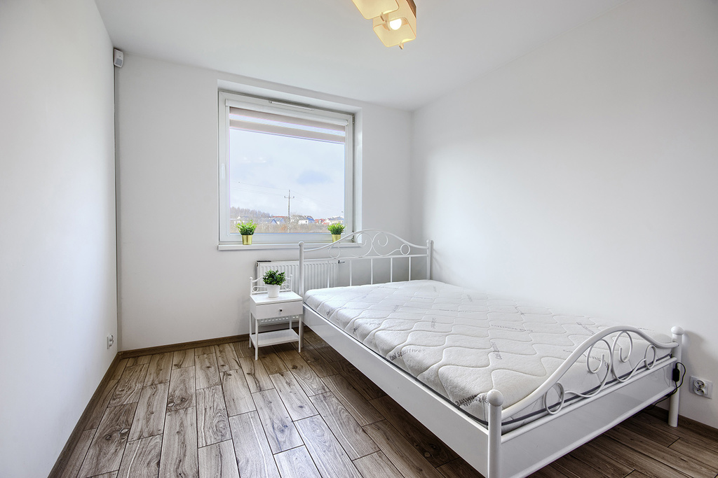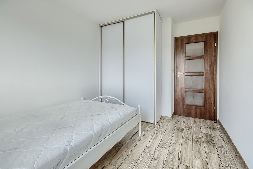 W sypialni znajdziemy szerokie łoże małżeńskie oraz szafę w zabudowie.