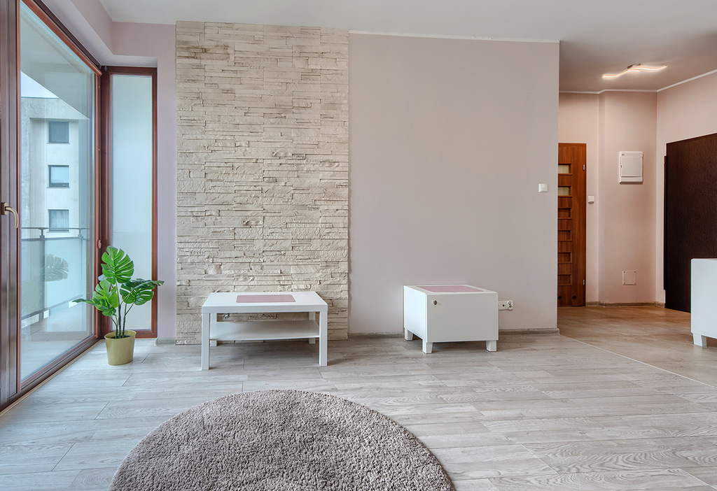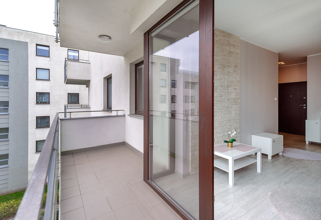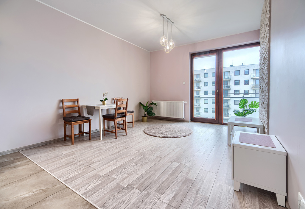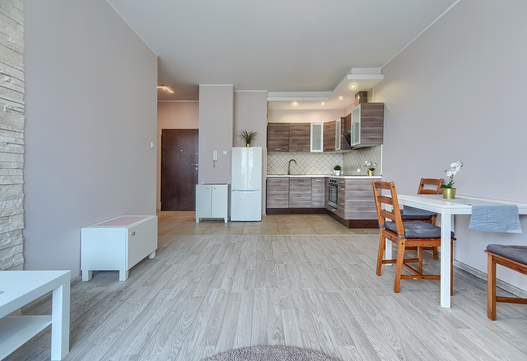 - salonu z aneksem kuchennym z wyjściem na duży słoneczny balkon