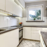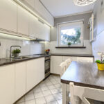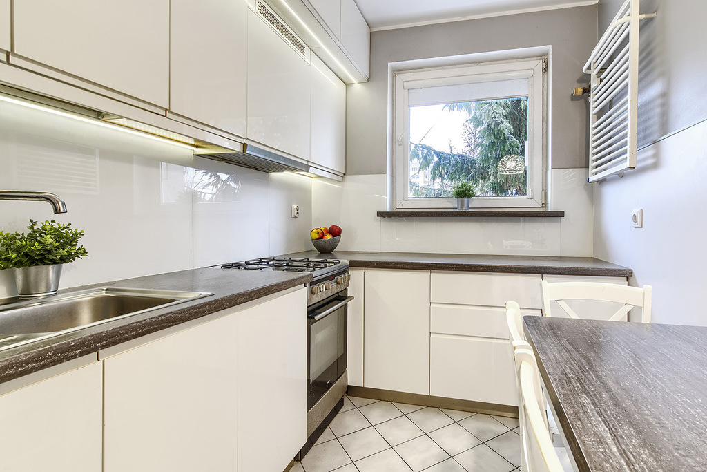 Kuchnia została zabudowana meblami na wymiar z pięknymi, białymi, lakierowanymi frontami na systemach marki Blum, wyposażona jest w sprzęt AGD: piekarnik, płyta gazowa, zmywarka, okap.
