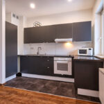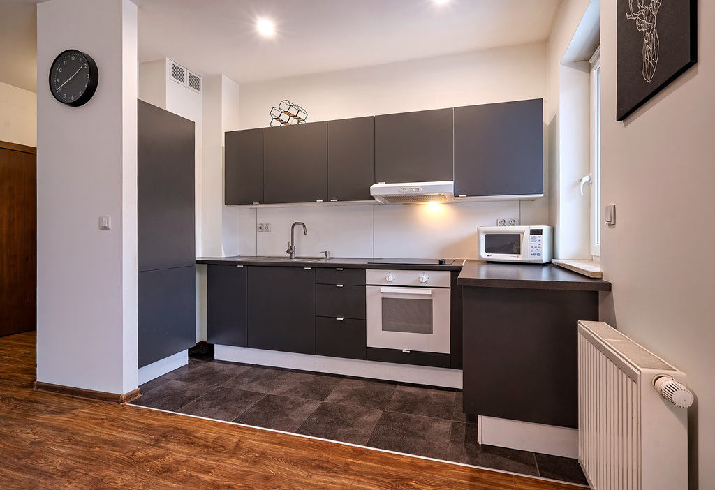 W kuchni zabudowa kuchenna.