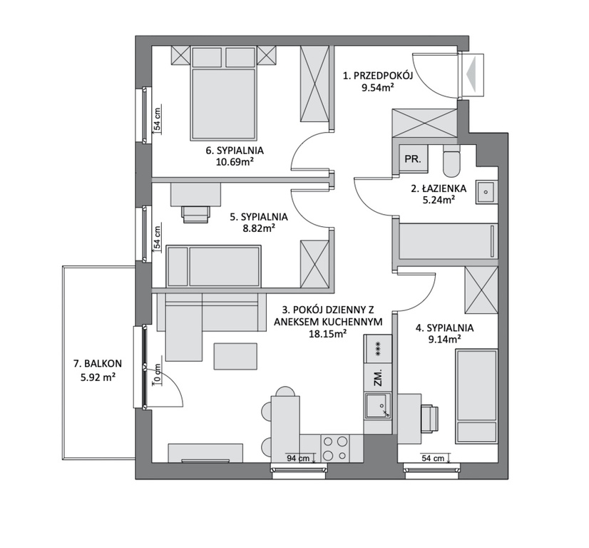- salonu z aneksem kuchennym (18,15 m2) z wyjściem na balkon (5,92 m2)