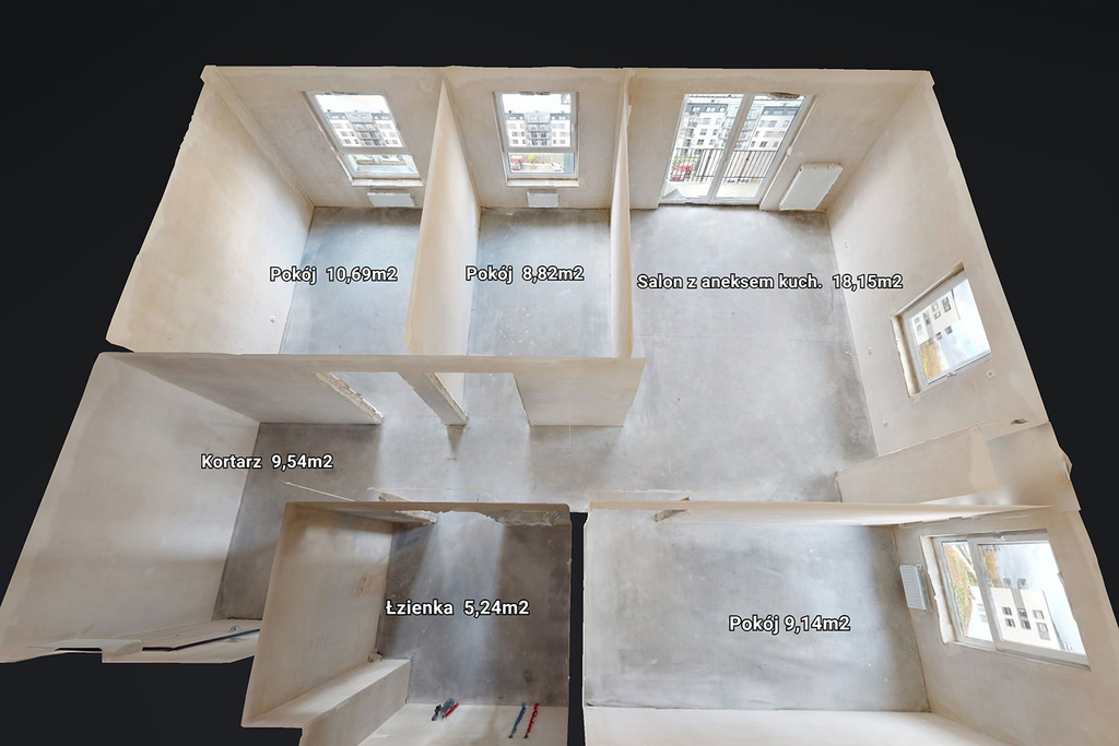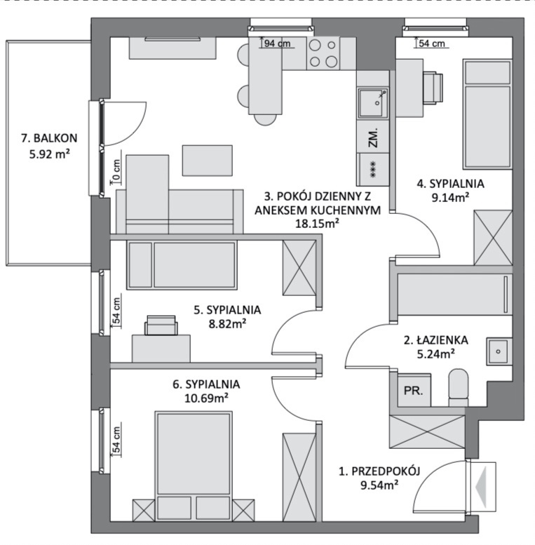 - salonu z aneksem kuchennym (18,15 m2) z wyjściem na balkon (5,92 m2)