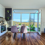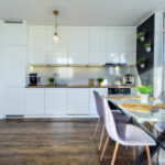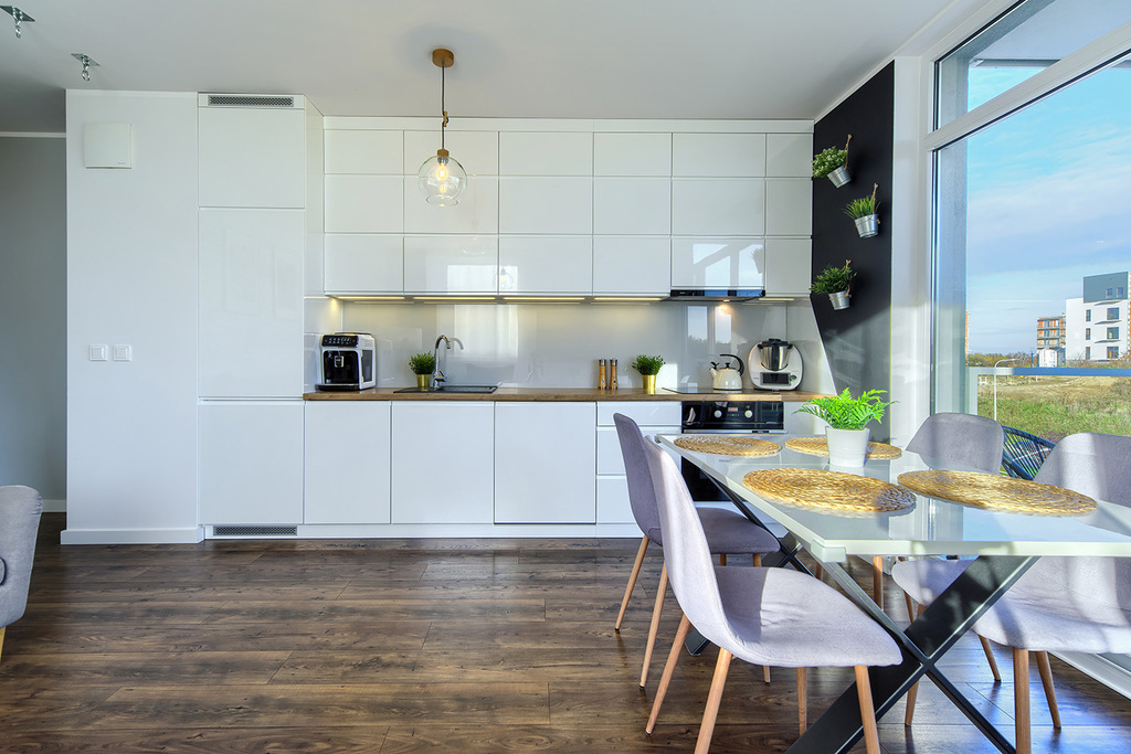 Kuchnia zabudowana jest meblami na wymiar z pięknymi białymi, lakierowanymi frontami i wyposażona jest w: lodówkę z zamrażalnikiem, piekarnik, płytę kuchenną, okap, zmywarkę.