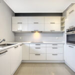 Kuchnia - duże i pojemne szafki w kolorze biały połysk. Zmywarka, płyta, piekarnik i lodówka w zabudowie