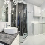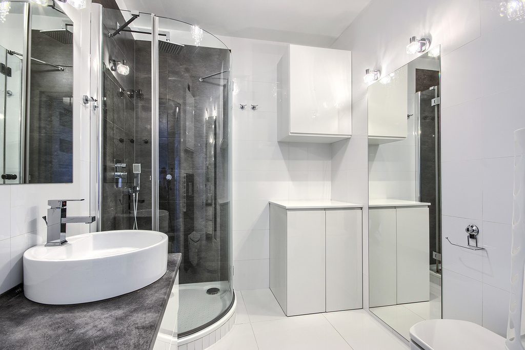 Łazienka - w stylu nowoczesnym, uniwersalna kolorystyka, miejsce na pralkę w szafce. Ogrzewanie podłogowe podłączone do C.O.