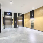 Prestiżowe lobby apartamentowca, z wyodrębnioną recepcją oraz komfortowym miejscem spotkań na antresoli, wprowadza do prywatnej strefy mieszkalnej.