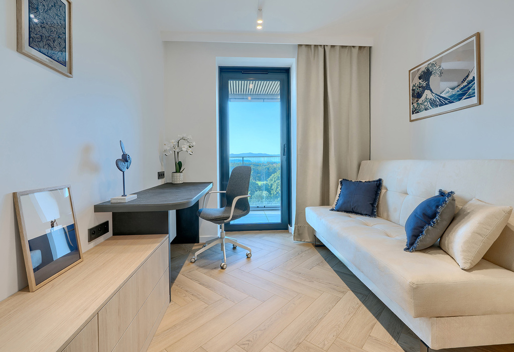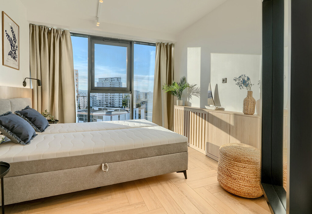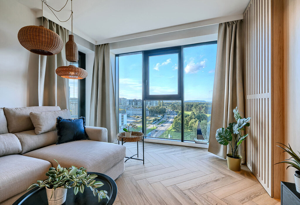 Apartament usytuowany na 9 piętrze z przepięknym, panoramicznym widokiem na całą Zatokę.