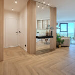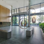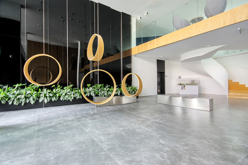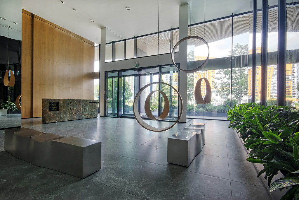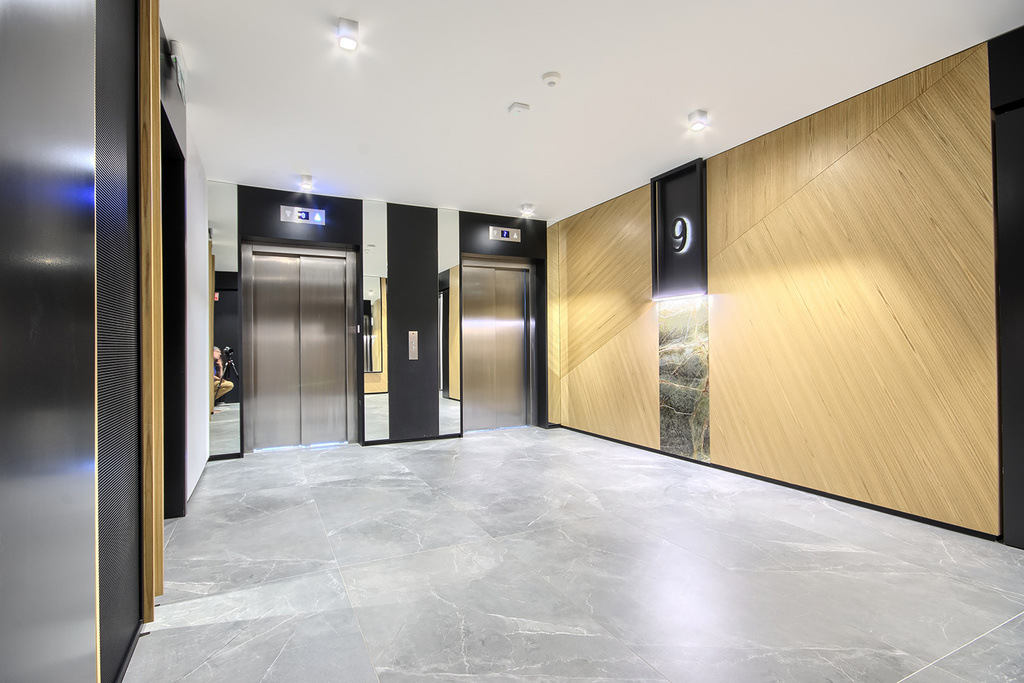Prestiżowe lobby apartamentowca, z wyodrębnioną recepcją oraz komfortowym miejscem spotkań na antresoli, wprowadza do prywatnej strefy mieszkalnej.