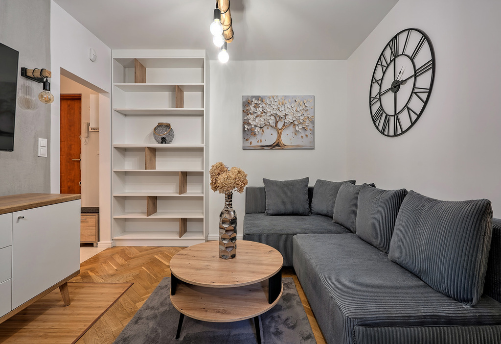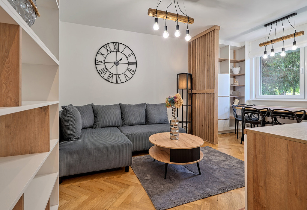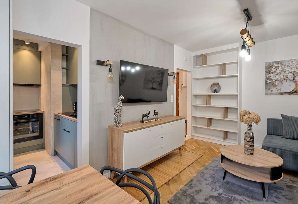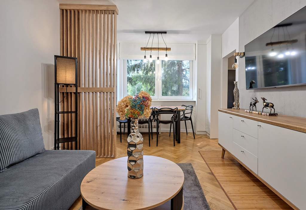 Pokój dzienny: Łączy w sobie strefę sypialną z wypoczynkową oraz jadalną nawet dla 4 osób. Dużo miejsca do przechowywania.