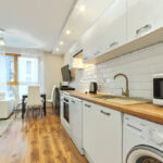 - lodówkę, pralkę, zmywarkę, piekarnik, okap, mikrofalówkę, garnki, patelnie, naczynia i sztućce.