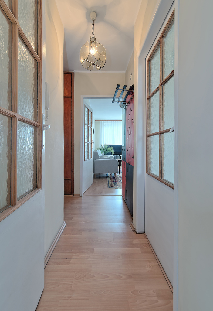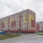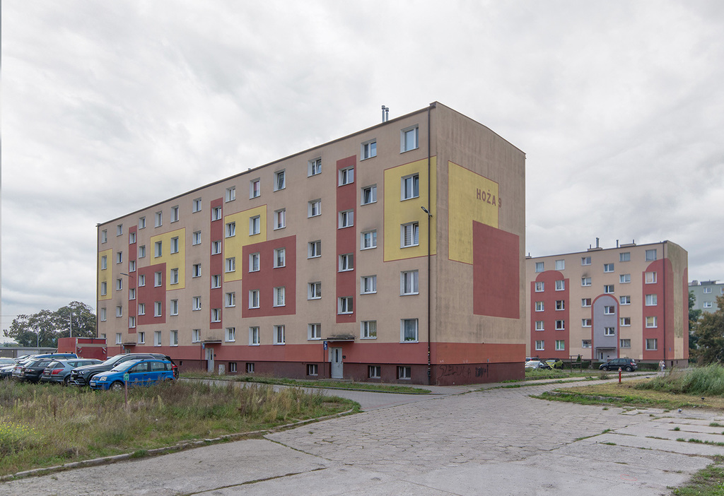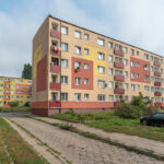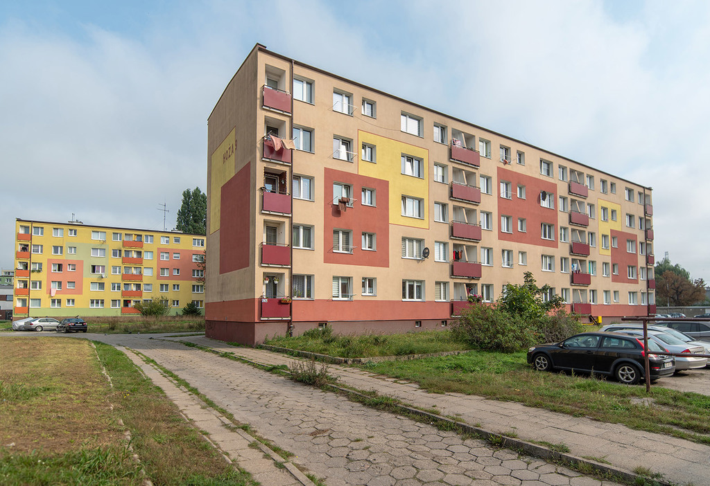 Niski kameralny blok, wejście do klatki schodowej zabezpieczone domofonem.