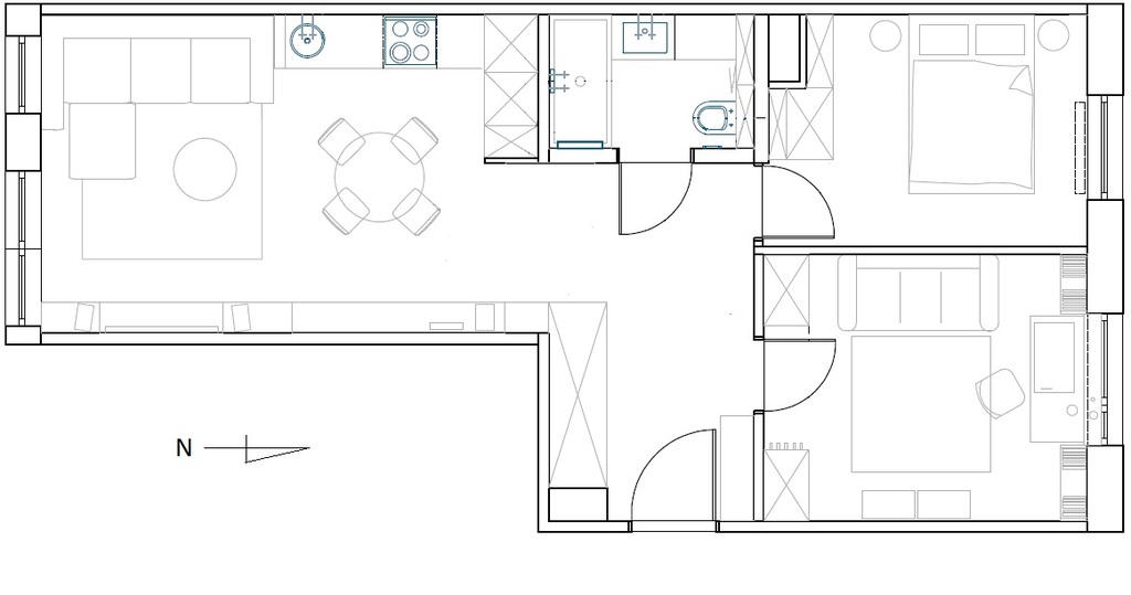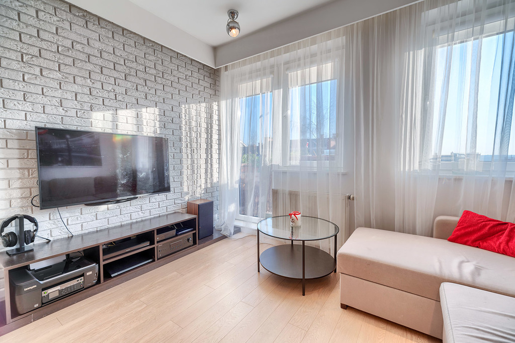 Nieruchomość składa się z salonu z aneksem kuchennym z wyjściem na balkon, 2 pokoi, łazienki z WC (ogrzewanie podłogowe) oraz funkcjonalnego przedpokoju z przestronnymi zabudowami typu Komandor. Ekspozycja okien: Mieszkanie dwustronne (Salon z Aneksem - Południowy zachód, Pokoje - Północny wschód). Do mieszkania przynależy piwnica.