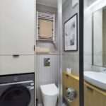 W łazience z dużą kabiną prysznicową, umywalką i toaleta znajduje się również pralka w zabudowie.