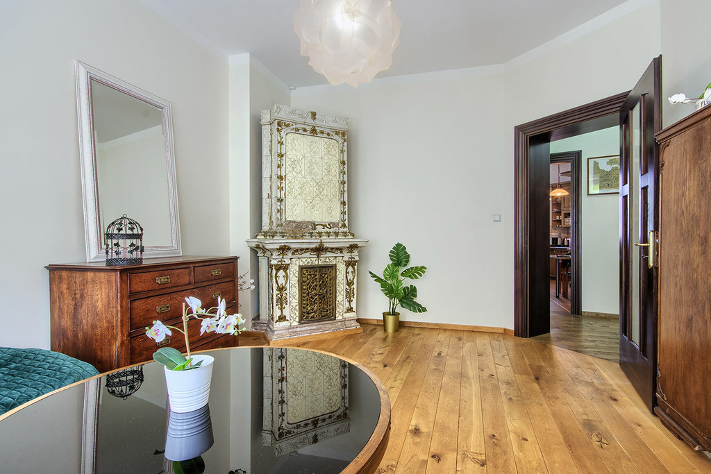 - HISTORIA - w mieszkaniu zachowany został oryginalny, kaflowy kominek czy ponad 100-letnie drewniane drzwi wejściowe - to niewątpliwa gratka dla koneserów miejsc " z duszą" o ciekawych walorach historycznych. Elegancji charakterystycznej dla mieszkań w kamienicach dodają również wysokie, ponad 3 - metrowe sufity,
