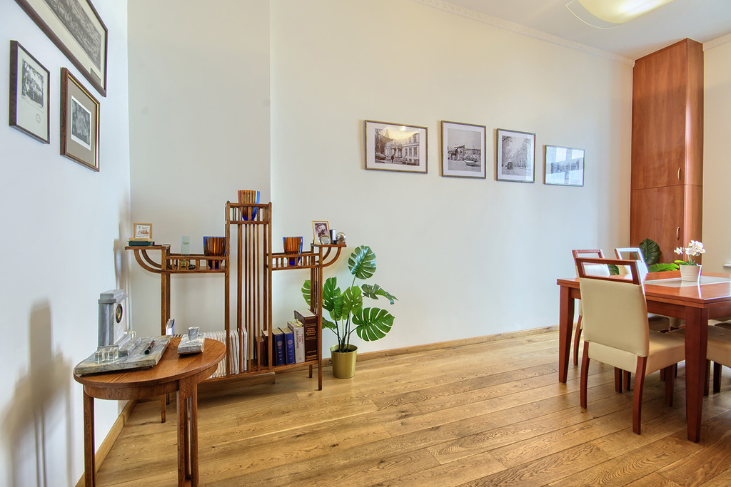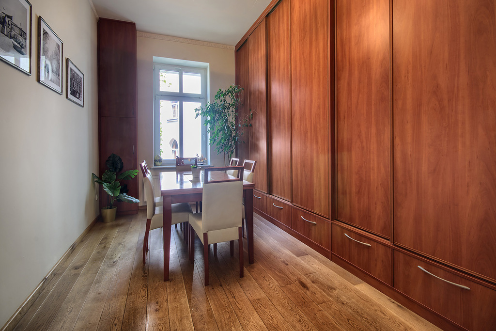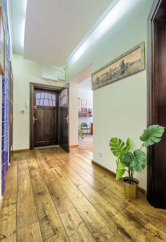 Na podłogach znajduje się wysokiej jakości dębowa oraz brzozowa deska podłogowa. Wszystkie drzwi wewnętrzne są drewniane i zostały wykonane przez stolarza na podobieństwo oryginalnie zachowanych drzwi wejściowych.