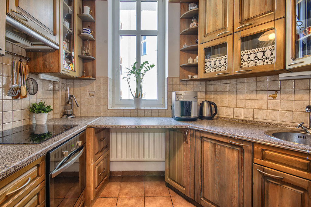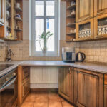 W kuchni znajduje się wykonana na wymiar drewniana zabudowa meblowa oraz kamienne blaty kuchenne.