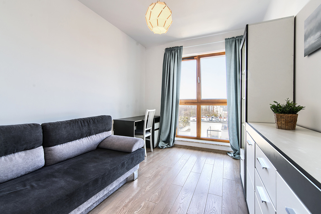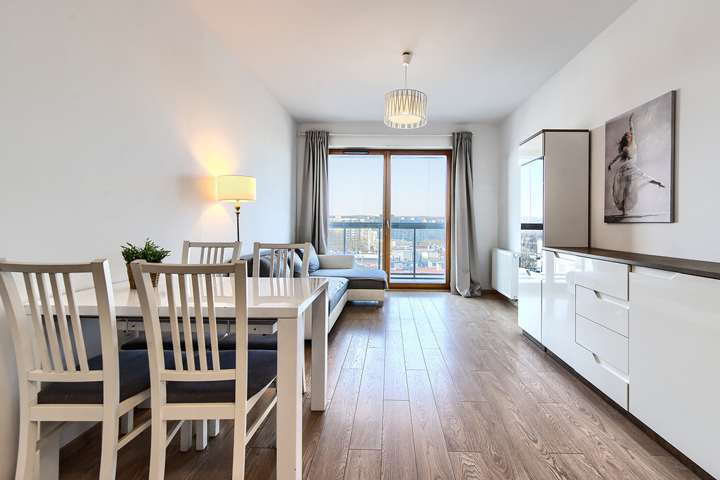 - przestronnego salonu z aneksem kuchennym oraz wyjściem na balkon z widokiem na miasto (19,89 m2),