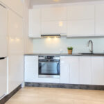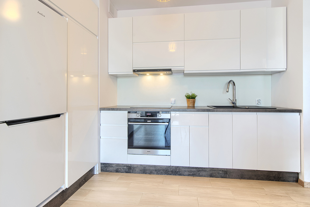 Kuchnia została zabudowana meblami z pięknymi, białymi, lakierowanymi frontami, jest w pełni wyposażona we wszelki niezbędny sprzęt AGD: piekarnik, płyta indukcyjna, okap, zmywarka, lodówka z zamrażarką.