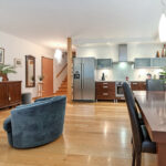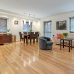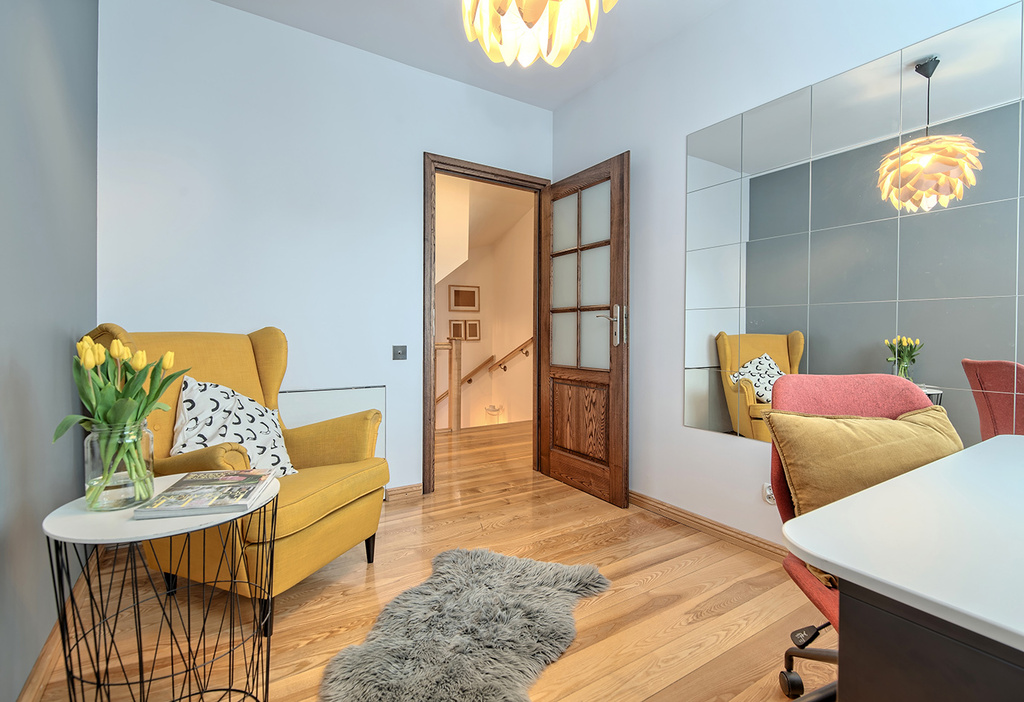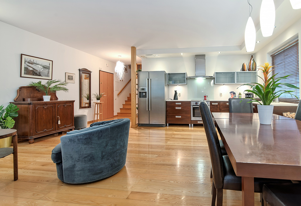 Przedmiotowy lokal został wykończony w podwyższonym standardzie, przy użyciu naturalnych i wysokiej jakości materiałów. Stolarka wewnętrzna w mieszkaniu, tj.: podłogi (z wyłączeniem łazienki), listwy przypodłogowe, drzwi (do łazienki i dwóch sypialni), schody oraz regał zostały wykonane z z litego drewna jesionowego.