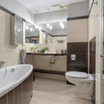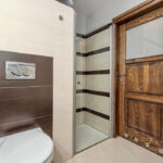 Łazienka wyposażona w duży prysznic typu walk in oraz narożną wannę.